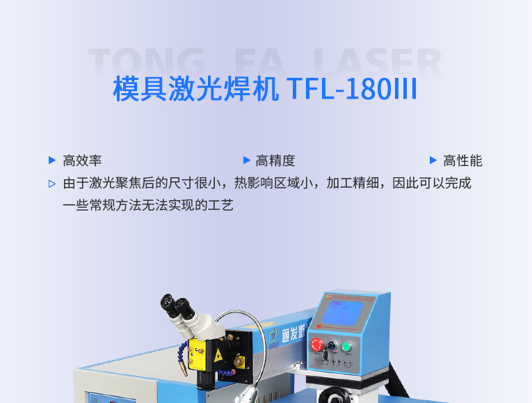 普通型模具激光焊機TFL-180Ⅲ是通發激光公司的模具激光焊機中銷量較大的傳統型,配置激光頭手搖升降與工作臺按鈕電動升降實現焊接不同厚度模具的激光焊加工。本系列機型適用于各類精密注塑模具激光補焊、壓鑄模具激光修補焊接;同時也適合鑄件沙孔激光修補、模具磨損激光修復、過切加工等的激光修補;各類金屬結構件激光焊接加工、金銀首飾激光焊接加工。